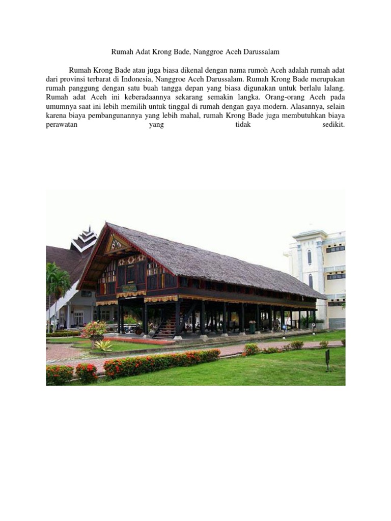 Penggunaan bahan dasar bangunan rumah krong bade diambil langsung dari alam. Memiliki banyak keunikan dan makna yang jarang diketahui. Penggunaan bahan dasar bangunan rumah krong bade diambil langsung dari alam. Apa nama rumah adat aceh?